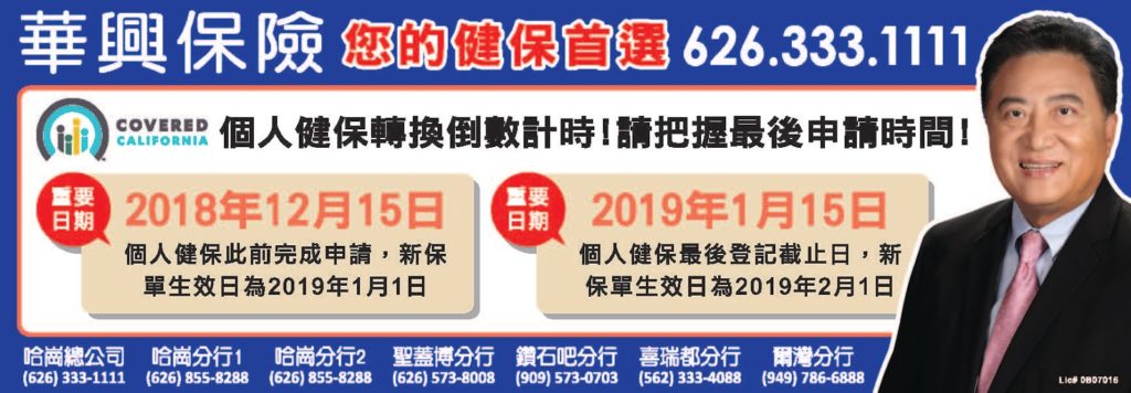 不小心错过12月15日,最后机会是在12月15日-2019年1月15日期间投保,而新保单生效日期,则会推后变成2月1日。 1月15日,对于大部分加州居民,则是投保或转换2019年健康保险的最后期限。 (除非符合新生儿、移民身份转换、失业、离婚、掉出白卡…… 等特殊投保状况